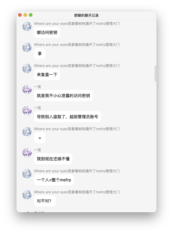 首先小Y 作为节点的赞助者,自然是持有 ME Frp 的服务端后台日志,之后他又发现用节点访问密钥就能登录后台其实是问过来的